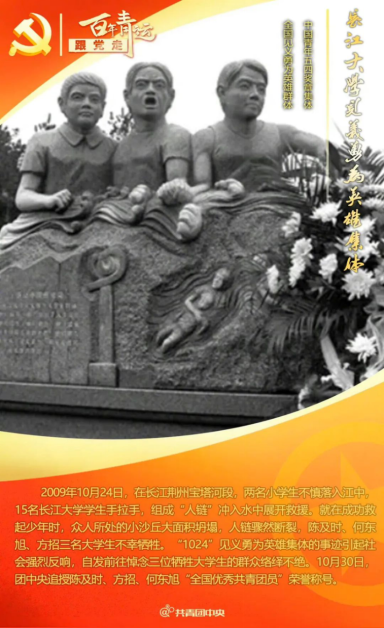 2009年10月24日,在长江荆州宝塔河段,两名小学生不慎落入江中,15名长江大学学生手拉手,组成“人链”冲入水中展开救援。就在成功救起少年时,众人所处的小沙丘大面积坍塌,人链骤然断裂,陈及时、何东旭、方招三名大学生不幸牺牲。“1024”见义勇为英雄集体的事迹引起社会强烈反响,自发前往悼念三位牺牲大学生的群众络绎不绝。10月30日,团中央追授陈及时、方招、何东旭“全国优秀共青团员”荣誉称号。